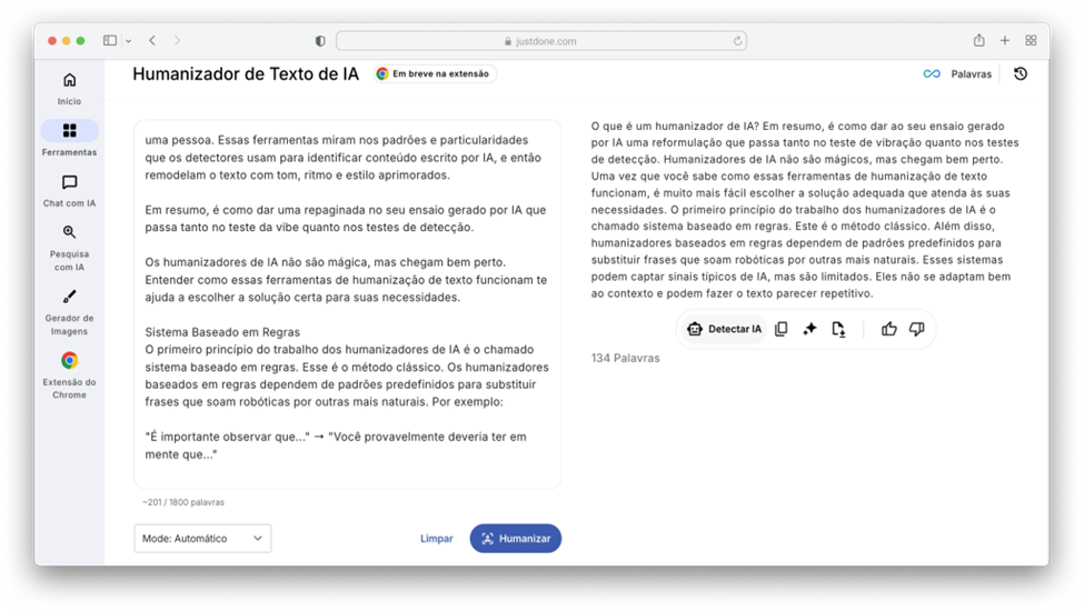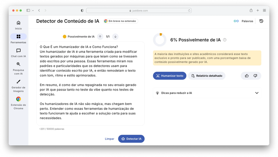 O JustDone AI, por exemplo, mostra não só um percentual de “detecção” mas também marca quais trechos do texto têm padrões mais mecânicos. Isso te dá a chance de reescrever as partes problemáticas antes que o professor as veja — não para enganar o sistema, mas para garantir que o texto que está sendo entregue representa de fato o seu pensamento.