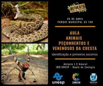 Na próxima quinta-feira, 04, o Parque Municipal “Joaquim Amaral Amando de Barros” será palco de uma importante aula. A Secretaria Adjunta de Turismo, o Conselho Municipal de Turismo e o Instituto de Biociências da Unesp de Botucatu realizam a aula “Animais peçonhentos e venenosos da Cuesta – Identificação e primeiros socorros”.