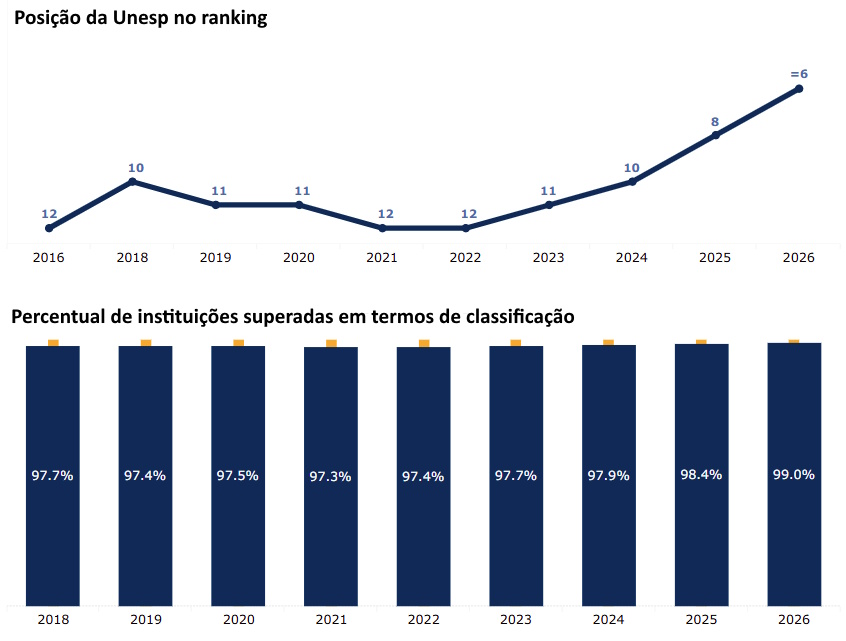 A sexta posição também consolida a contínua melhora nas avaliações da Unesp no levantamento: desde 2021, a Universidade tem melhorado continuamente sua posição no ranking, saindo da 12ª obtida em 2021 para a sexta colocação alcançada neste ano.