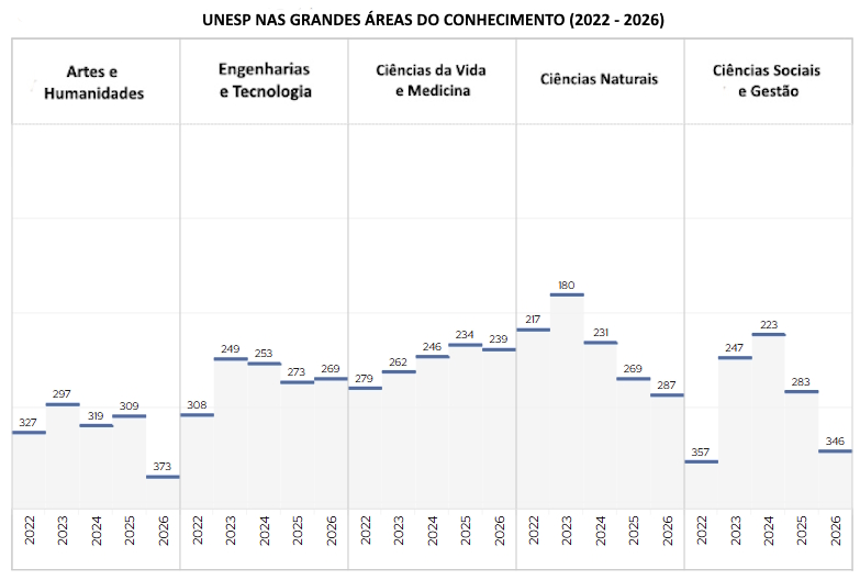 O ranking também fez um levantamento por grandes áreas do conhecimento que contempla Artes e Humanidades; Engenharias e Tecnologia; Ciências da Vida e Medicina; Ciências Naturais; e Ciências Sociais e Gestão. O desempenho da Unesp nos últimos anos pode ser visto na imagem abaixo: