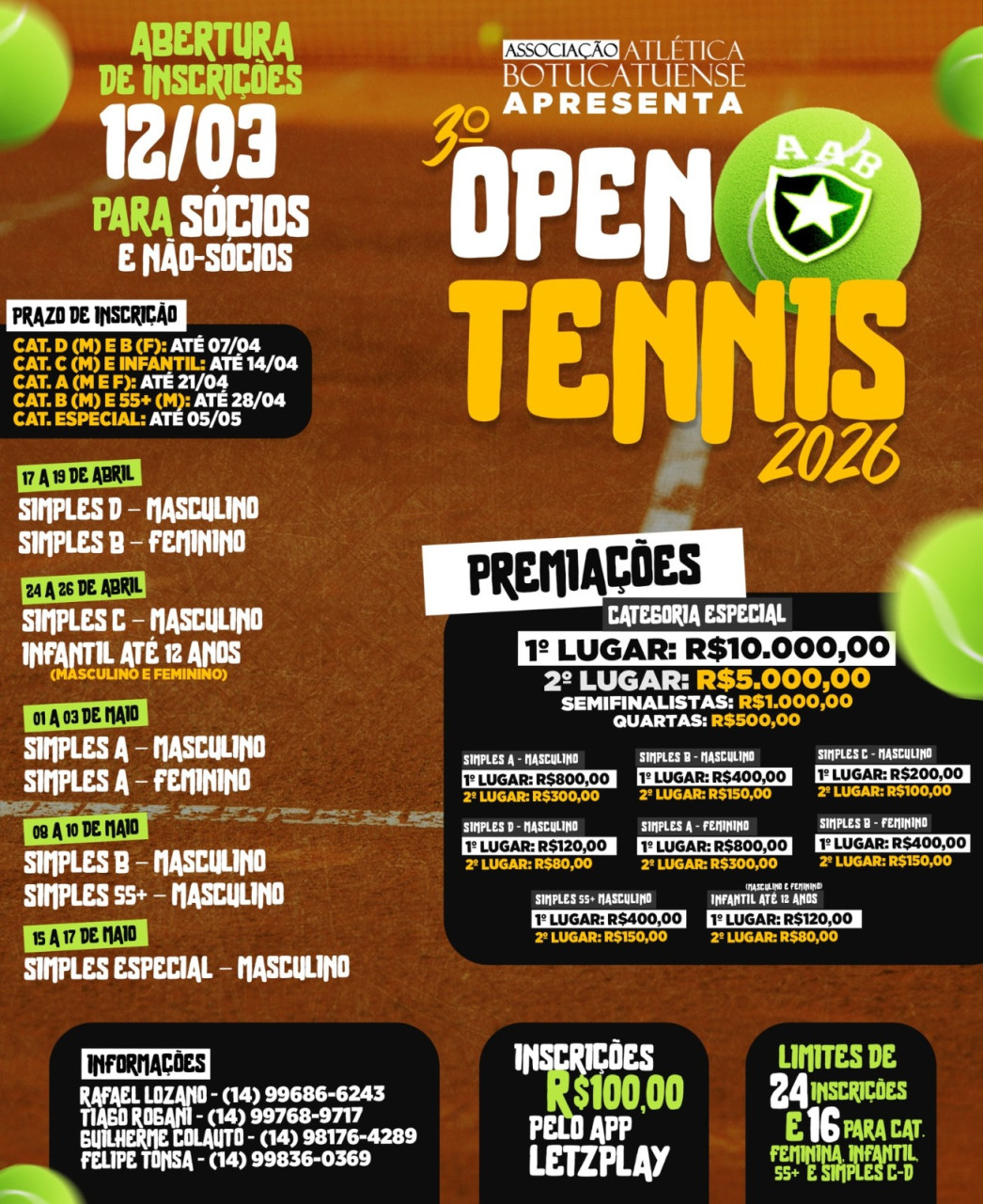 As inscrições custam R$ 100 e devem ser feitas pelo aplicativo LetzPlay. As vagas são limitadas a 24 atletas por categoria, com 16 vagas nas categorias femininas, infantil, 55+ e também nas categorias C e D masculinas. Todos os inscritos receberão a camiseta oficial do torneio.