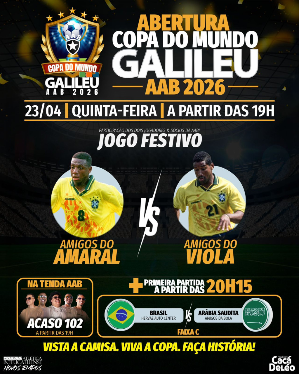 A Associação Atlética Botucatuense (AAB) realiza nesta quinta-feira, 23 de abril, a abertura oficial da Copa do Mundo Galileu AAB 2026. A programação começa às 18h, no campo suíço do clube, com atrações esportivas e musicais voltadas aos associados.