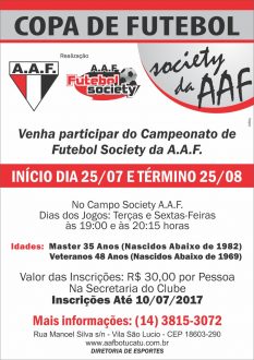 Seguem até o dia 10 de julho, as inscrições para o Campeonato de Futebol Society da Associação Atlética Ferroviária (AAF) de Botucatu. Podem participar sócios do clube, que serão divididos em duas categorias: master 35 anos (nascidos abaixo de 1982) e veteranos 48 anos (nascidos abaixo de 1969).