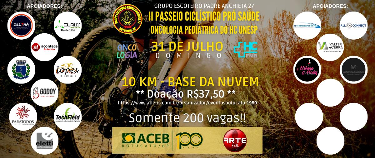 O Grupo de Escoteiros Padre Anchieta 027, em parceria com a Associação Comercial Empresarial de Botucatu (ACEB) e Associação Beneficente Arte Real de Botucatu (ABAR), promoverá o “II Passeio Ciclístico Pró Saúde”.