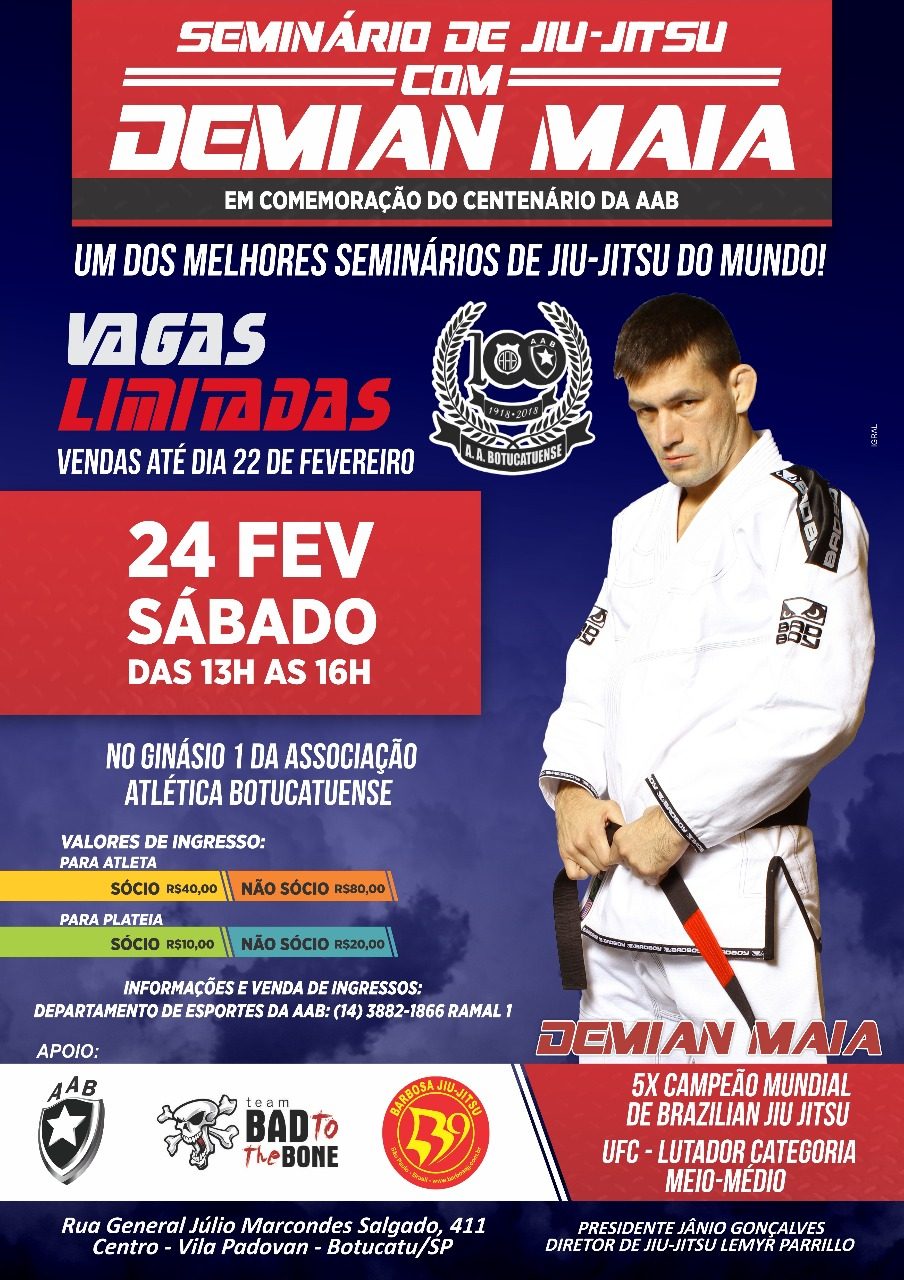 Fazendo parte da programação das comemorações do centenário do clube, a Associação Atlética Botucatuense (AAB) promove no sábado, dia 24, Seminário com Demian Maia. O evento será realizado no ginásio 1 a partir das 13h.