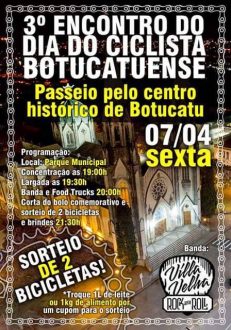 Nesta sexta-feira (7) está marcado o terceiro Encontro em Comemoração ao Dia do Ciclista Botucatuense (15 de abril), incluído no Calendário Oficial do Município através da Lei Municipal nº 5.662, de 2014. A concentração para o passeio ciclístico desta sexta está marcada para as 19 horas, em frente ao Parque Municipal – “Joaquim Amaral Amando de Barros”, no Jardim Paraíso, região norte de Botucatu. A atividade é uma iniciativa do movimento Pedala Botucatu, que reúne centenas de adeptos da modalidade.