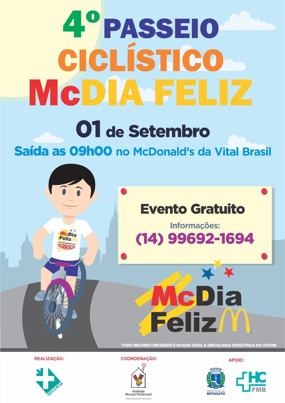 Acontece neste sábado, 1º de setembro, o 4º Passeio Ciclístico McDia Feliz. A saída das bicicletas está marcada para as 9h, no McDonald’s da Avenida Vital Brazil. O evento é gratuito e será realizado para celebrar o sucesso do McDia Feliz, comemorado no último dia 25 de agosto.