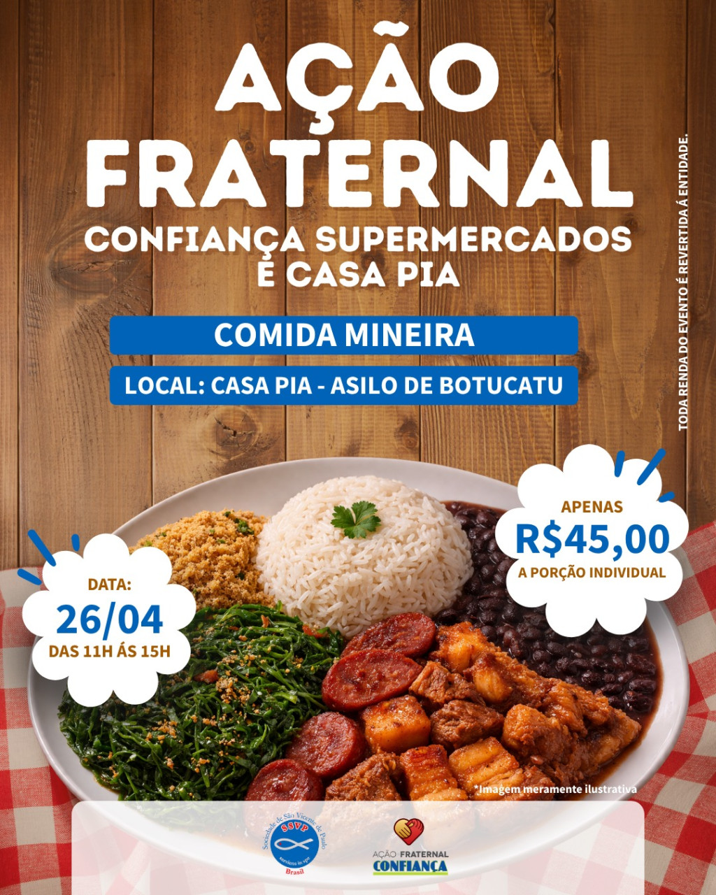 A Casa Pia de Botucatu, em parceria com o Supermercado Confiança, realiza neste domingo, 26 de abril, mais uma edição do tradicional Almoço Mineiro beneficente.