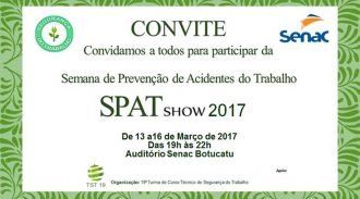 Será realizada de 13 a 16 de março a SPAT (Semana de Prevenção de Acidentes do Trabalho) do Senac de Botucatu. O evento é realizada anualmente pelos alunos do Curso Técnico em Segurança do Trabalho, com o intuito de aprimorar o potencial, orientar e desenvolver temáticas voltadas à prevenção e qualidade de vida da população, através de palestras, atividades e sorteios de brindes para os participantes.