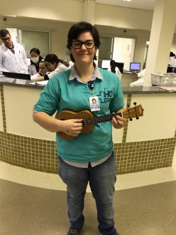 Isadora comprou um instrumento chamado Ukulele, mais conhecido como “violão havaiano”, e desde então, aprendeu a tocar por conta própria. “Escolho algumas músicas e o som vai saindo. A equipe da unidade me acompanha sempre que pode. A música é uma forma de levar conforto a essas famílias”, explica.