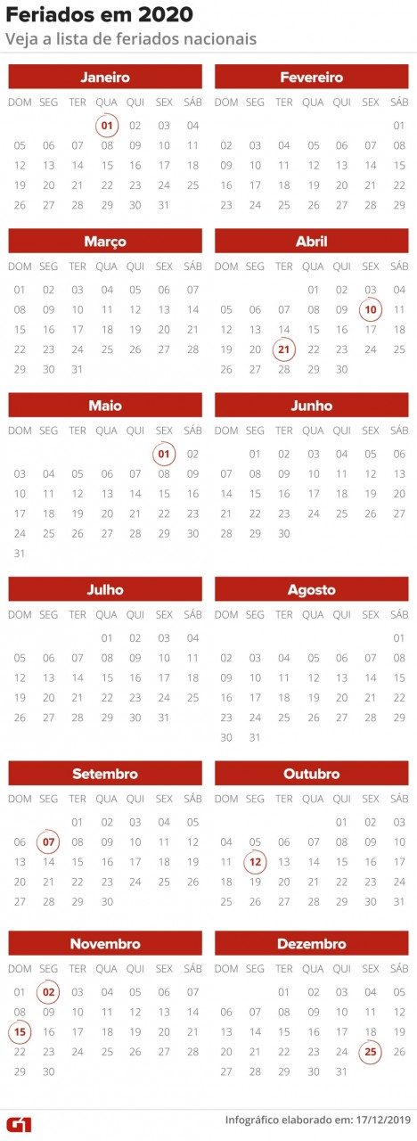 O calendário de 2020 terá 9 feriados nacionais, sem contar os feriados estaduais e municipais, como o do Dia da Consciência Negra e aniversários das cidades. Dos nacionais, seis serão prolongados – isto é, vão cair em segundas ou sextas-feiras e, portanto, emendam com o final de semana. Só um deles vai cair em um final de semana: 15 de novembro, data da Proclamação da República, será em um domingo.
