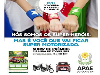 No Largo da Catedral estarão expostos os prêmios oferecidos pela APAE: um carro e duas motos. O sorteio será no dia 25 de novembro, sábado. Os interessados em adquirir uma cartela podem entrar em contato com a APAE pelo telefone 3811-1310.
