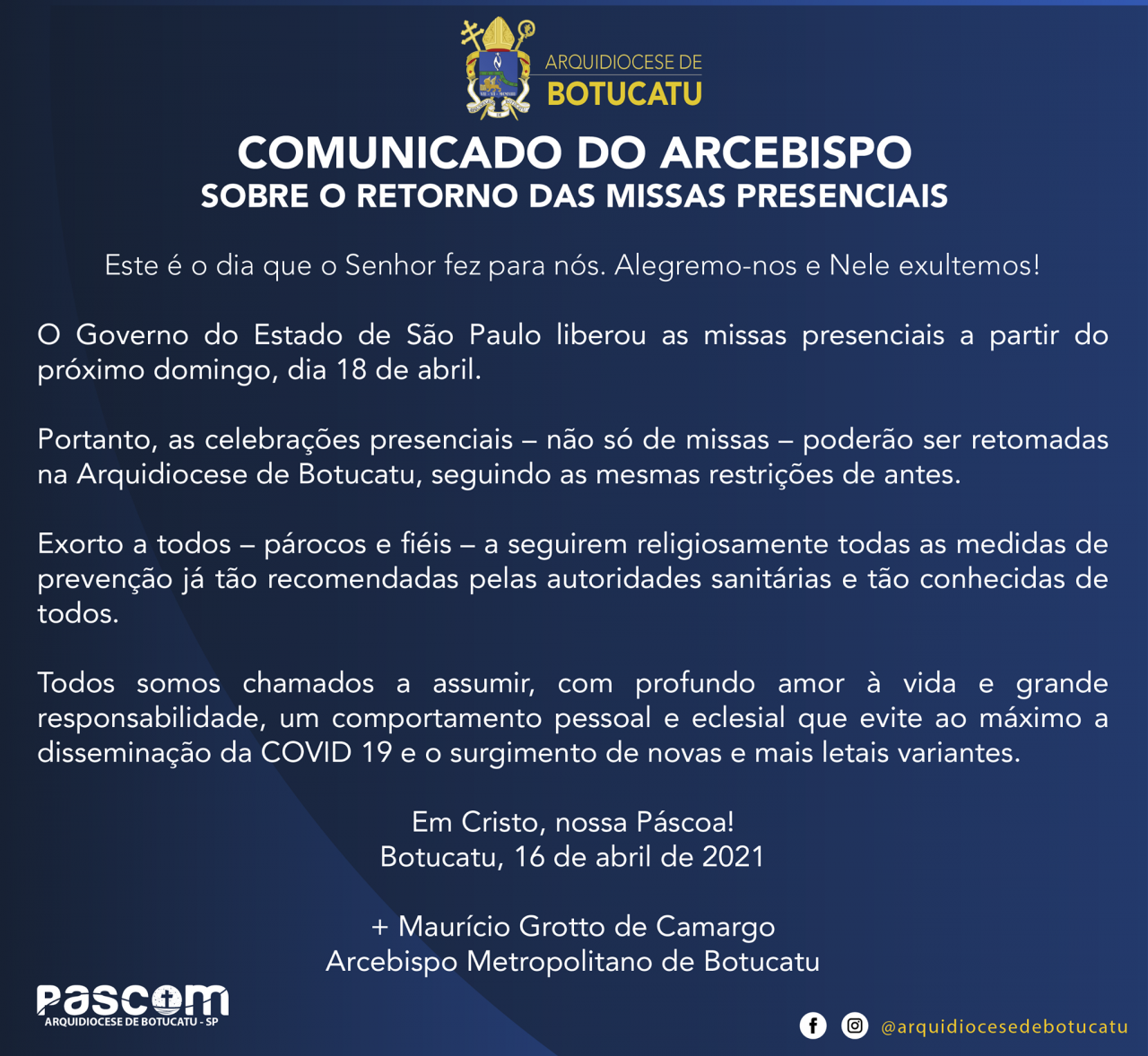 O Arcebispo Dom Maurício emitiu um comunicado permitindo o retorno das celebrações presenciais, conforme Decreto do Governo do Estado de São Paulo, a partir do próximo domingo, 18 de abril. As paróquias deverão seguir todas as restrições e cuidados para a prevenção da disseminação da COVID-19.