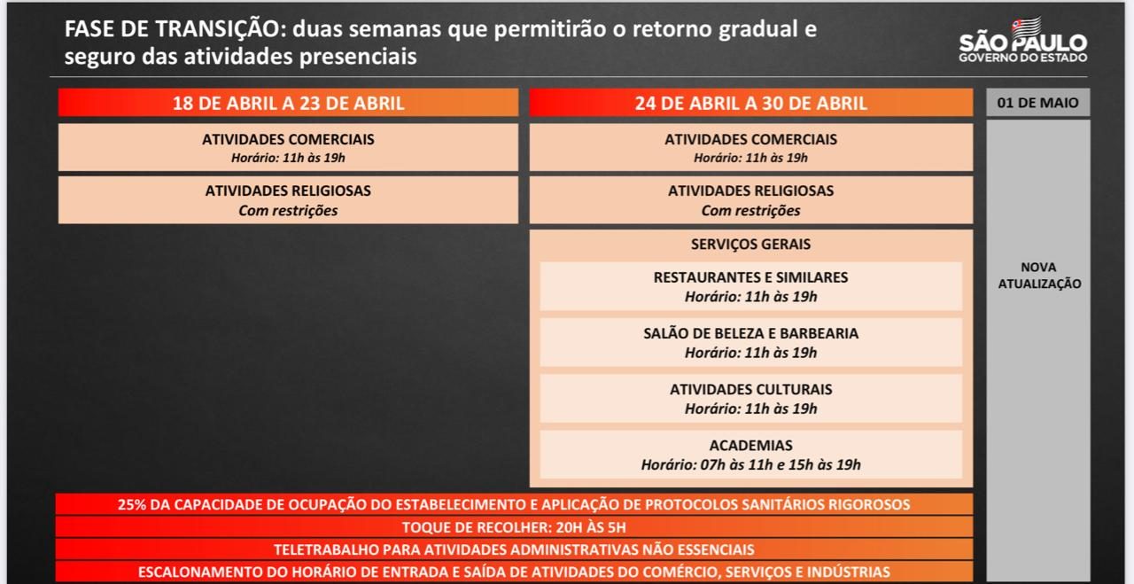 A medida foi estipulada pelo governo do estado como uma fase transitória, cujo o objetivo possibilita a liberação gradual de outros setores da economia, considerados não essenciais, pelo estado, até o final de abril. Uma nova atualização deve acontecer em 1º de maio.