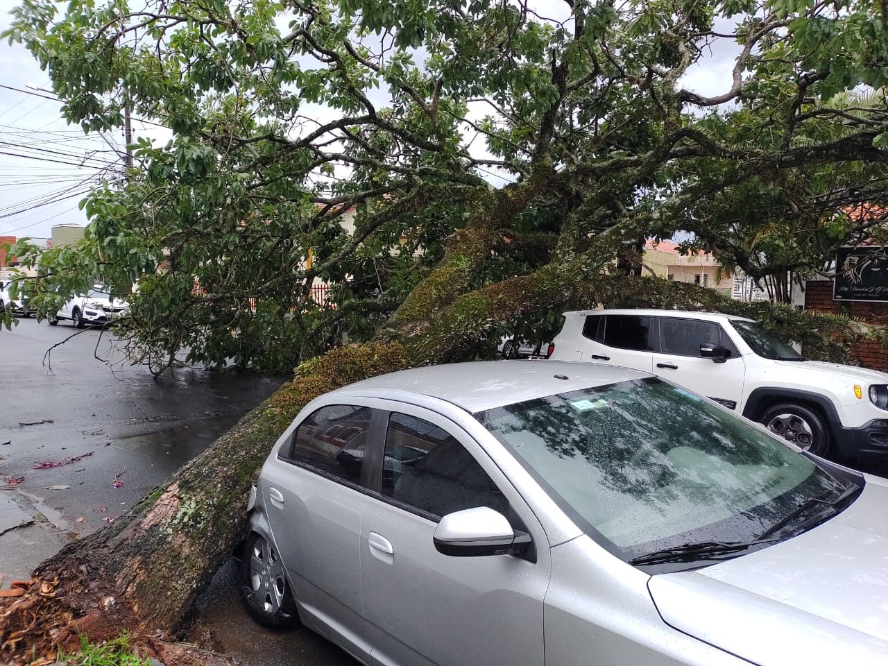 Uma árvore caiu sobre um veículo após a chuva que atingiu a área central da cidade. O carro ficou destruído.