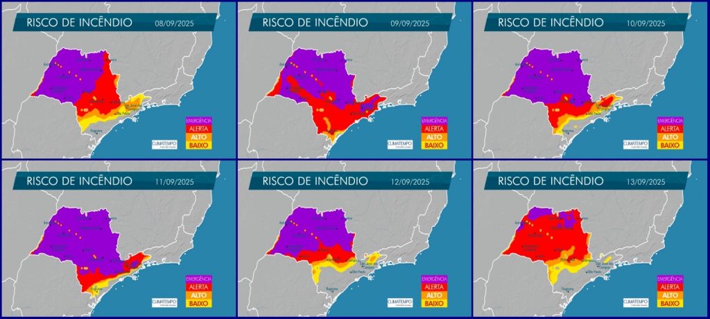 Segundo o monitoramento do CGE, as cidades atingiram índices de umidade próximos a 12% e temperaturas acima dos 35°C. Conforme o Mapa de Risco de Incêndio da Defesa Civil, os municípios dessas regiões encontram-se em nível de emergência para queimadas.