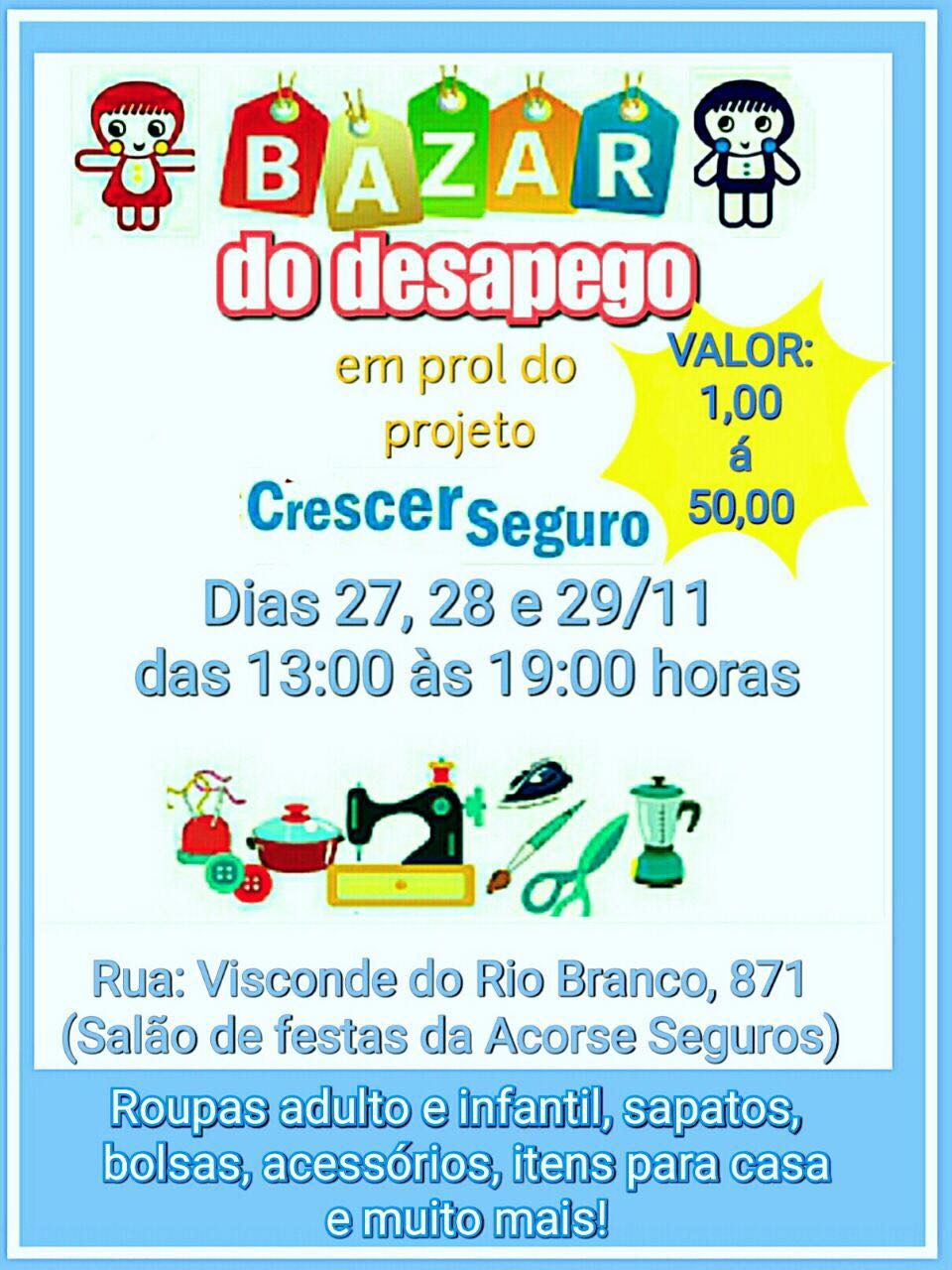 Um grupo de voluntárias fará a partir da próxima segunda-feira, dia 27, um bazar beneficente em prol do Projeto Crescer Seguro. O local escolhido é o salão da Acorse Seguros, na Rua Visconde do Rio Branco, 871.