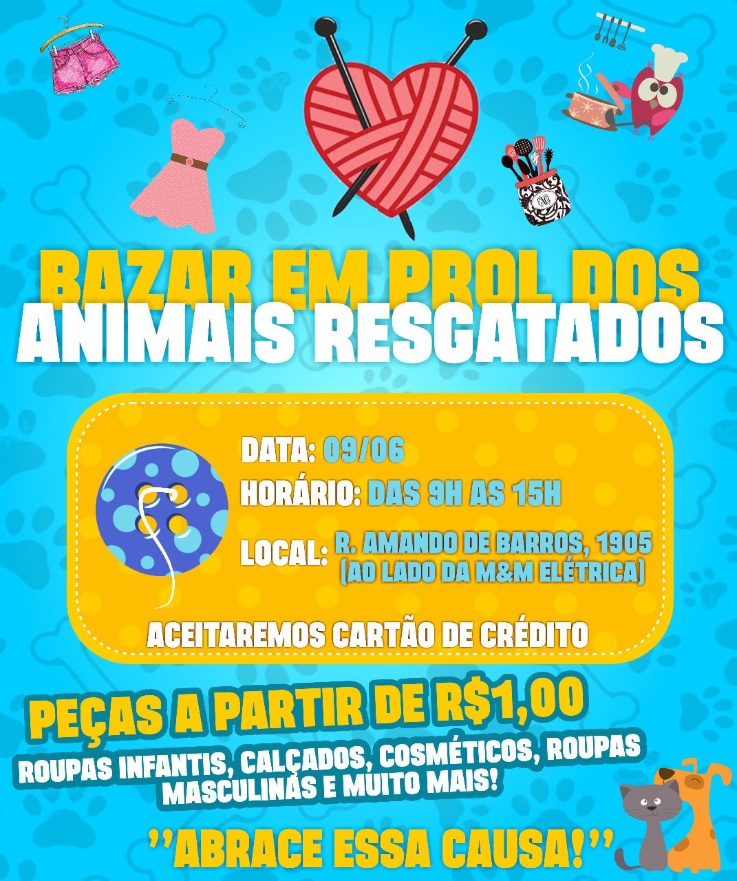 No próximo sábado, dia 09, será realizado um bazar em prol dos animais resgatados em Botucatu. O local do evento será na Rua Amando de Barros, 1905, ao lado da M&M Elétrica, área central da cidade.