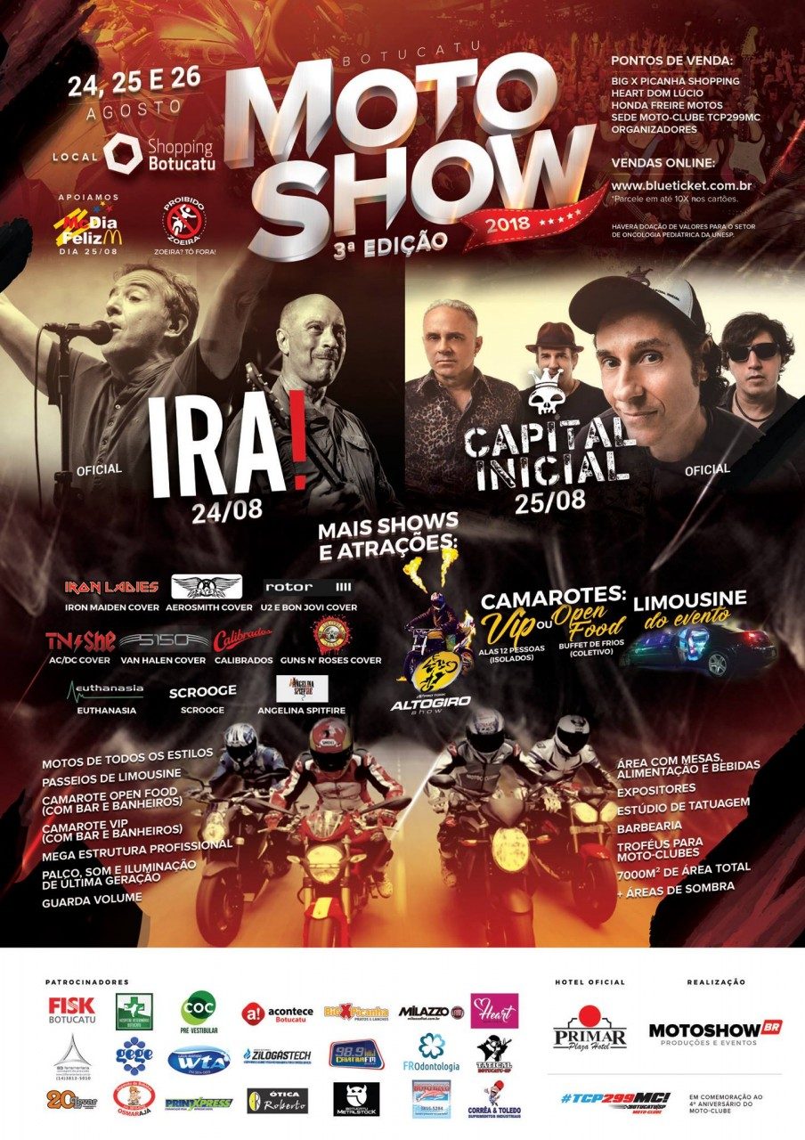 Para os amantes das motocicletas, haverá também o Protork Alto Giro Show, com manobras e atrações que prometem tirar o fôlego do público. O Botucatu MotoShow 2018 ainda comemora o 4º aniversário do Moto Clube Tacalepau 299 e é produzido pelo MotoShow BR Produções e Eventos.