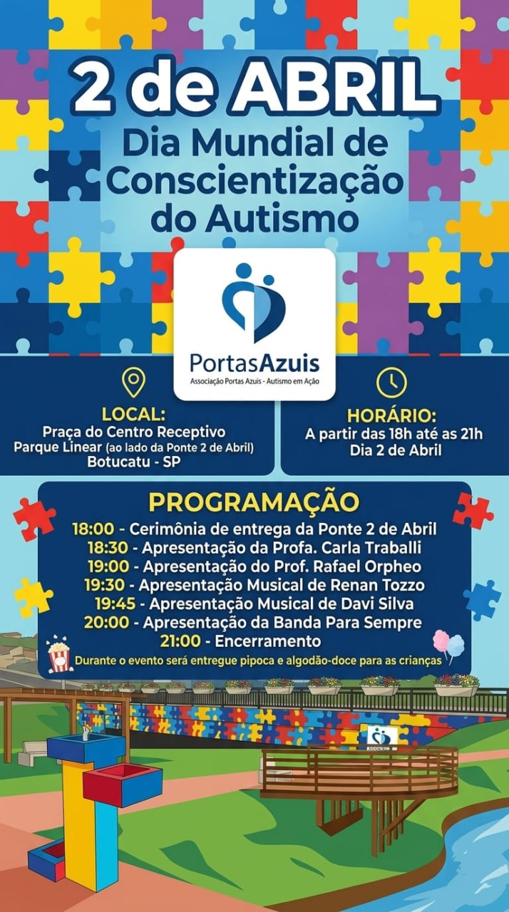 Botucatu recebe nesta quarta-feira, 2 de abril, uma programação especial em alusão ao Dia Mundial de Conscientização do Autismo. O evento será realizado na Praça do Centro Receptivo do Parque Linear, ao lado da Ponte 2 de Abril, com início às 18h e atividades até as 21h.