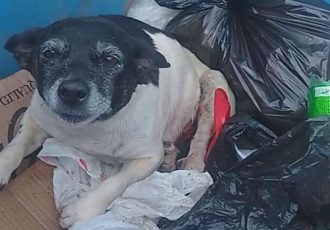 Cachorra ferida é resgatada dentro de lixeira em Rubião Junior e passa por avaliação