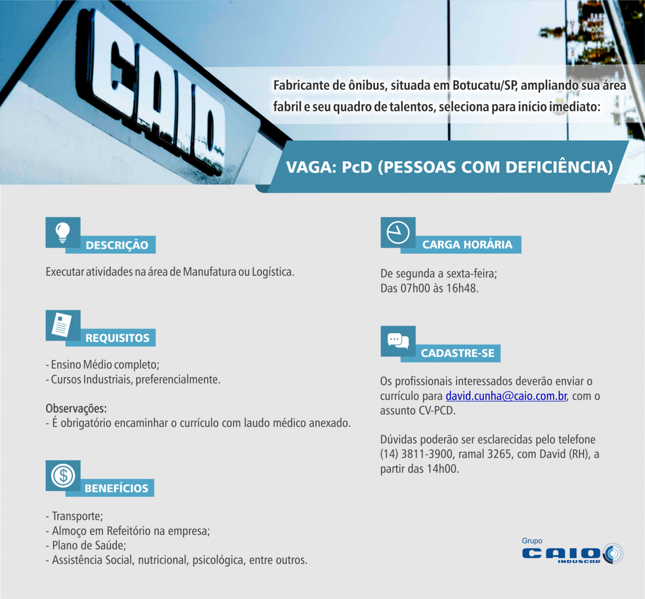 O Grupo Caio informou nesta sexta-feira, dia 09, que ainda está recebendo currículos para preenchimento de vagas específicas para PcD (pessoas com deficiência).