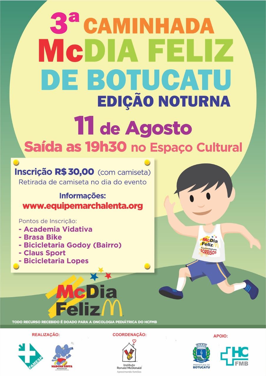 Neste sábado, 11, acontece a 3ª Caminhada Mc Dia Feliz de Botucatu. E, desta vez, a ação será no período noturno, saindo às 19h30 do Espaço Cultural (Av. Dom Lúcio, 497-595, Centro). Além da caminhada, os inscritos poderão participar de uma aula de zumba com o Prof. Zuel.