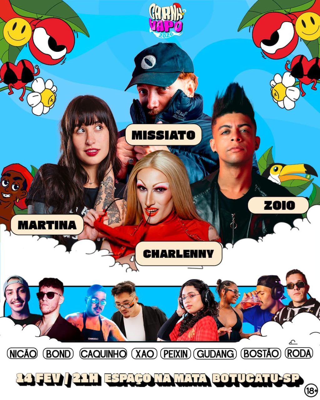 O evento contará com 12 artistas no line-up, reunindo nomes com forte engajamento nas redes sociais e presença em grandes festas universitárias do país. Entre as atrações confirmadas estão DJ Zoio, Martina, Missiato e Charlenny, que levam ao público uma mistura de eletrônica, pop e funk, estilos que marcam eventos como Interunesp, Tusca e Submundo 808.