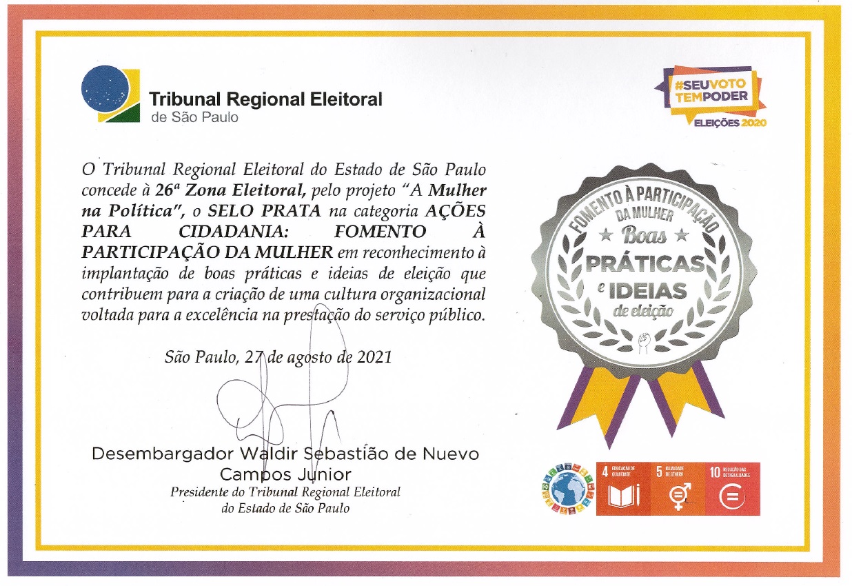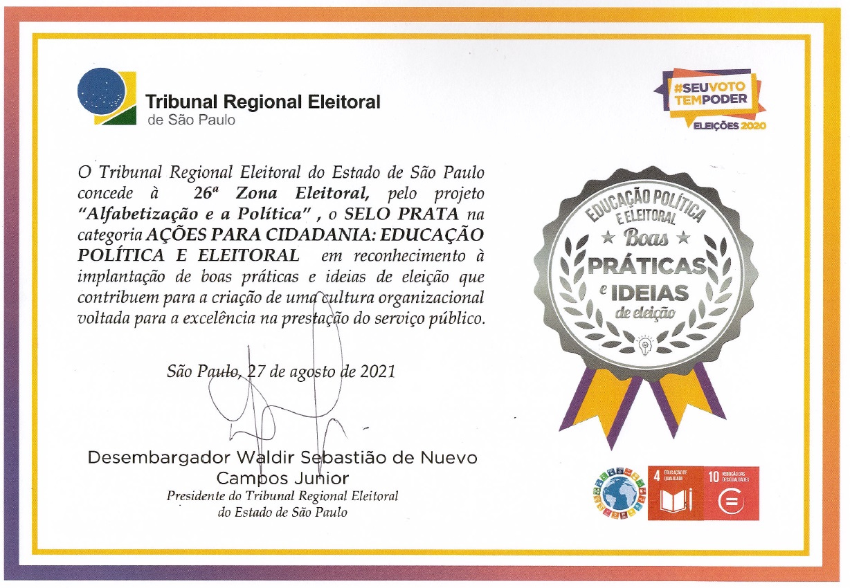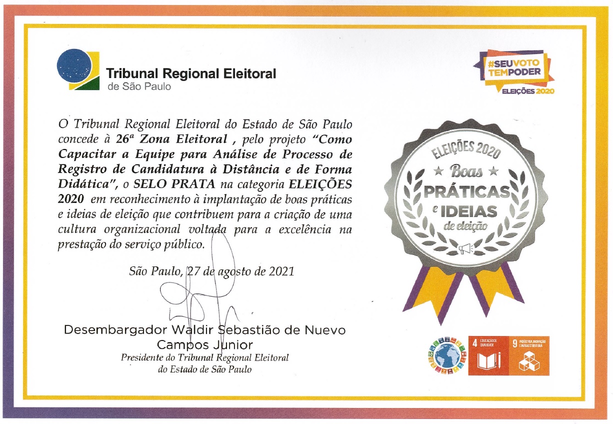 O Presidente do TRE/SP, Desembargador Waldir Sebastião de Nuevo Campos Júnior, encaminhou três premiações para o Cartório Eleitoral de Botucatu em reconhecimento à implantação de boas práticas e ideias de eleição que contribuem para a criação de uma cultura organizacional voltada para a excelência na prestação do serviço público: