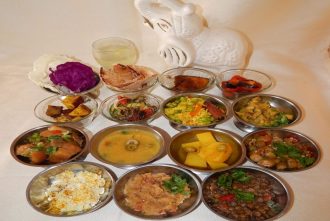 PULAO (Arroz c/legumes), Legumes Assados, Chana Dal (Grão de Bico), Chapati (pão) Dahl Palak (Lentilha), Pasta queijos, Ricota Indiana, Vindalho Porco, Frango Indiano, verduras Aguas aromatizadas, Ponche , Sobremesa e Chá.