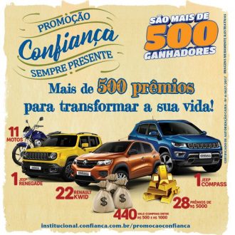 A rede Confiança Supermercados inova mais uma vez e lançou na última sexta-feira, dia 08, sua já esperada campanha de fim de ano que irá premiar mais de 500 clientes. Intitulada “Confiança Sempre Presente”, a ação irá sortear 440 prêmios em vale compras nos valores de R$ 500,00 e R$ 1.000,00, 28 certificados de R$5.000 em barra de ouro, além de 11 motos CG 160 Start, 22 veículos Renault Kwid, 1 Jeep Renegade e 1 Jeep Compass.