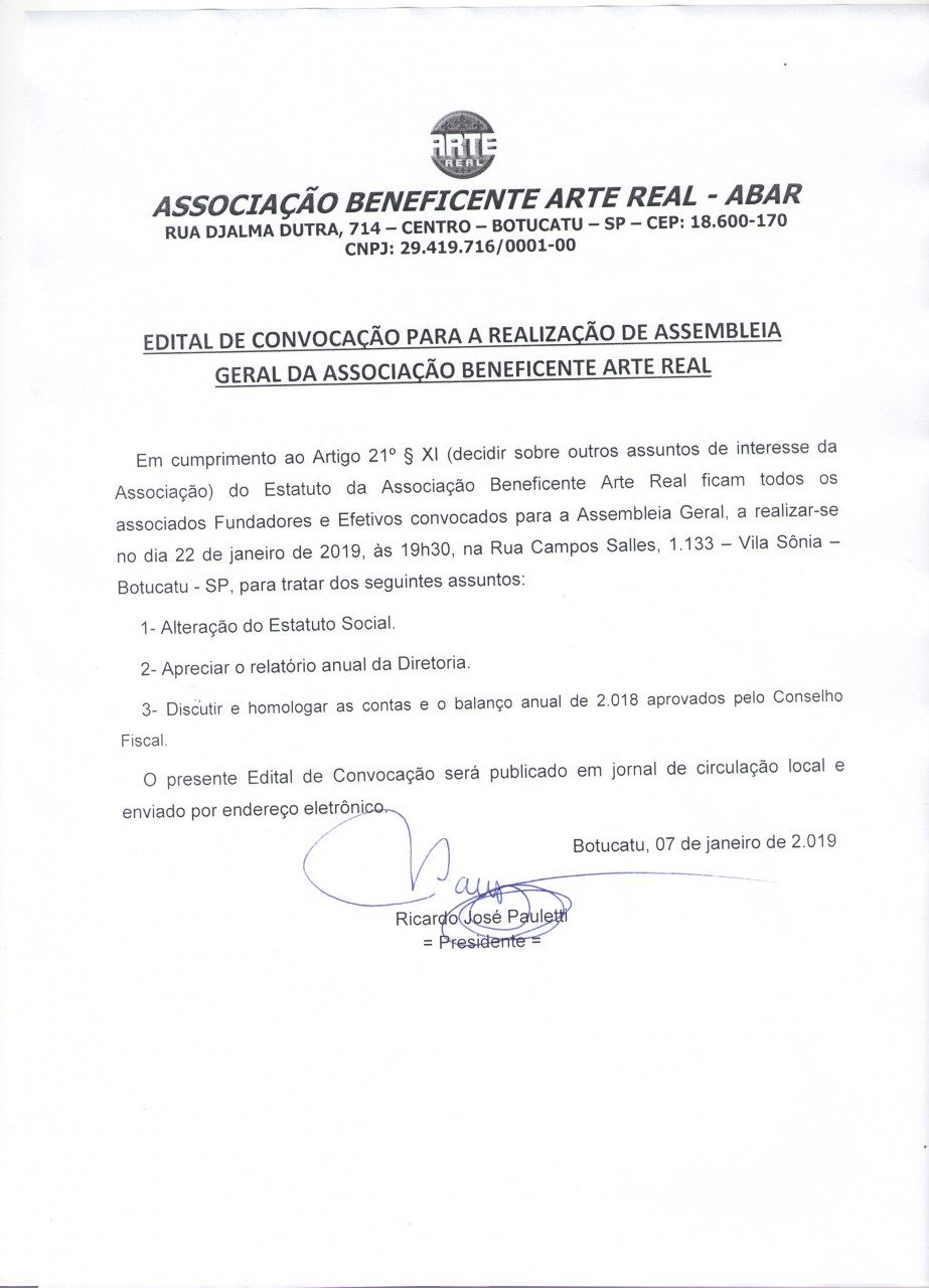 Em cumprimento ao Artigo 21º § XI (decidir sobre outros assuntos de interesse da Associação) do Estatuto da Associação Beneficente Arte Real ficam todos os associados Fundadores e Efetivos convocados para a Assembleia Geral, a realizar-se no dia 22 de janeiro de 2019, às 19h30, na Rua Campos Salles, 1.133 – Vila Sônia – Botucatu – SP, para tratar dos seguintes assuntos: