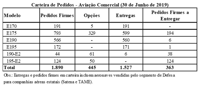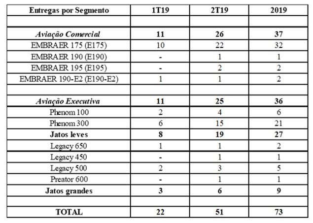 A Embraer entregou um total de 51 jatos no segundo trimestre de 2019 (2T19), dos quais 26 foram jatos comerciais e 25 foram jatos executivos (sendo 19 leves e 6 grandes). A carteira de pedidos firmes a entregar em 30 de junho totalizava USD 16,9 bilhões na comparação a USD 16,0 bilhões no fim do 1T19. O aumento no backlog da Embraer no 2T19 é devido, em grande parte, à demanda contínua do mercado, principalmente pela nova família de jatos Praetor na Aviação Executiva. Veja tabela: