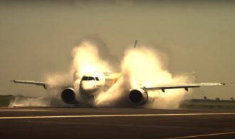 O último teste de certificação do jato E190-E2 analisou o comportamento dos sistemas da aeronave em pista molhada, fase conhecida como “teste de spray”. Os três dias de ensaios, realizados na semana passada, foi conduzido na fábrica da Embraer em Gavião Peixoto (SP) e monitorado pela Agência Nacional de Aviação Civil (ANAC).
