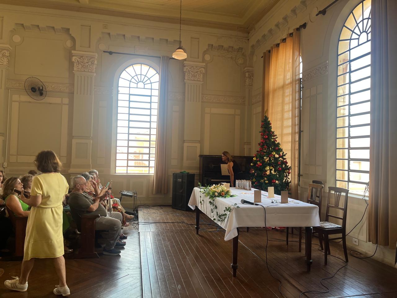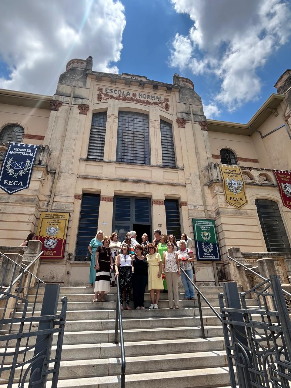 Durante a visita, o grupo fez um tour pelos espaços históricos da escola, passando pelo Salão Audio-Visual e seguindo até o Salão Nobre, onde as formandas entoaram o Hino da Escola Normal sob a regência da professora Vera Claudia.