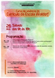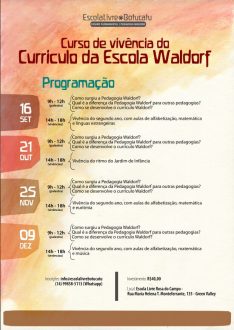 Serão explicadas as diferenças entre a pedagogia Waldorf para a pedagogia tradicional, o que é o currículo e na parte da tarde a vivencia das aulas. Os professores nestes eventos darão aulas aos adultos. Sempre aos sábados, uma vez por mês; confira o calendário. Mais informações pelo telefone 14 98119-0786