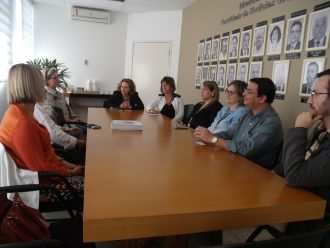 Os representantes da Fapesp foram recebidos pela vice-diretora da FMB, professora Maria Cristina Pereira Lima (Kika), pelo coordenador do EAP, professor Carlos Magno C.B. Fortaleza, e pelos servidores técnico-administrativos Rita de Cássia Athanázio (coordenadora técnica), Cristiane Marta S. Coquemala (coordenadora), Cinthia Scolástico Cecílio (secretária) Cristina Maria Teixeira Fortes (assistente de suporte acadêmico) e Felipe Isidoro Bernardi (assistente de suporte acadêmico).