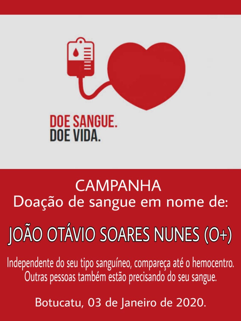 Familiares e amigos de uma criança estão fazendo uma campanha para doação de sangue em Botucatu. A doação pode ser feita no Hemocentro do Hospital das Clínicas de Botucatu em nome do garoto João Otávio Soares Nunes.