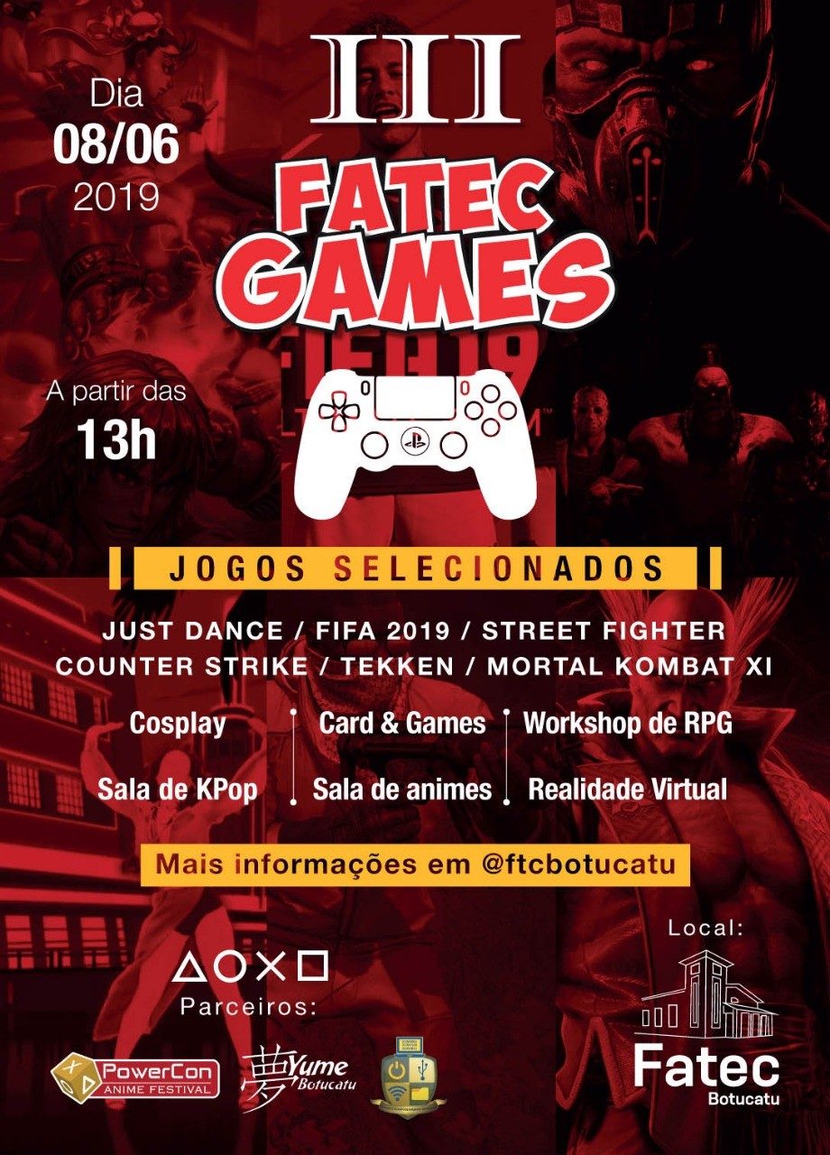 A Faculdade de Tecnologia de Botucatu promoverá no sábado, 08 de junho, a partir das 13h, a terceira edição do Fatec Games. O evento ocorre anualmente, organizado por alunos, auxiliares docentes e professores do Curso Superior de Análise e Desenvolvimento de Sistemas (ADS) da Faculdade.