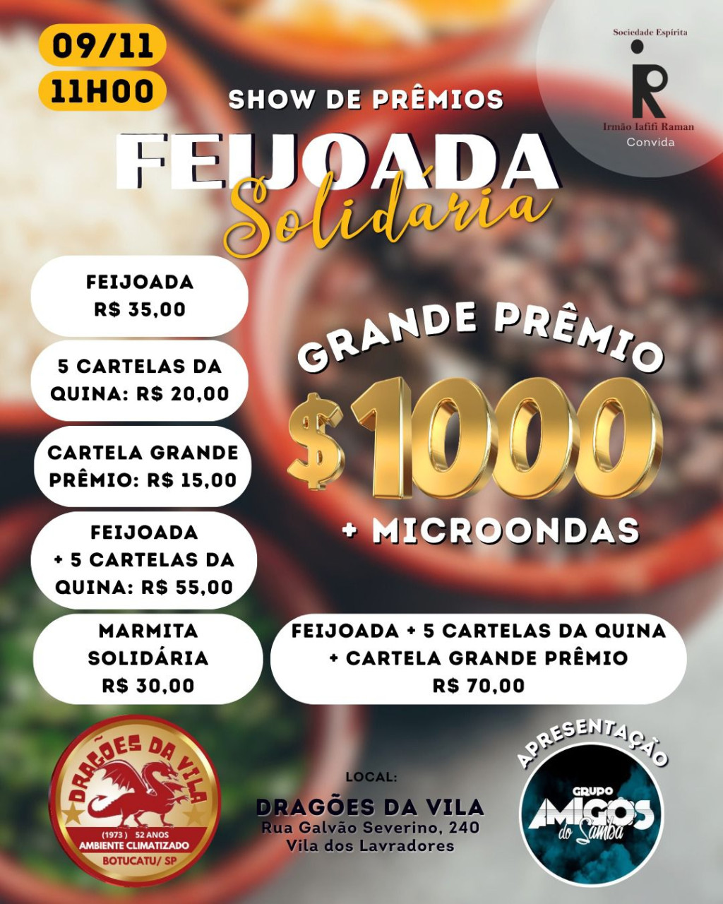 A Sociedade Espírita Irmão Iafifi Raman, em parceria com o Dragões da Vila, promoverá no dia 9 de novembro, a partir das 11 horas, uma Feijoada Solidária com Show de Prêmios, no Dragões da Vila (Rua Galvão Severino, 240 – Vila dos Lavradores, Botucatu).