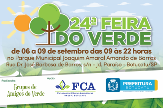 De 6 a 9 de setembro, o Grupo Amigos do Verde, com o apoio da Secretaria Municipal do Verde e da Faculdade de Ciências Agronômicas da Unesp de Botucatu, realiza a 24ª edição da Feira do Verde.