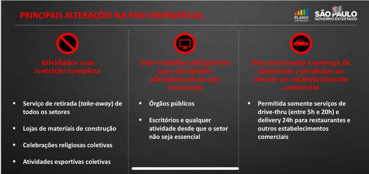 O Governador de SP, João Doria, anunciou nesta quinta-feira, 11, medidas mais restritivas em todo estado. Chamada de fase de emergência, o período terá duração de 15 dias, começando na segunda-feira, dia 15, permanecendo até o dia 30.