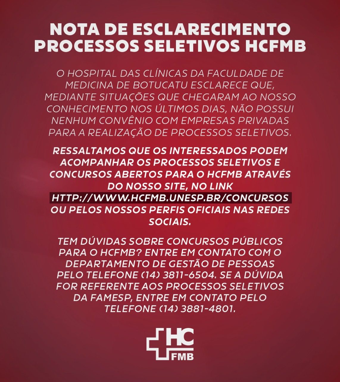 O Hospital das Clínicas da Faculdade de Medicina de Botucatu (HCFMB) esclarece que, mediante situações que chegaram ao nosso conhecimento nos últimos dias, não possui nenhum convênio com empresas privadas para a realização de processos seletivos.