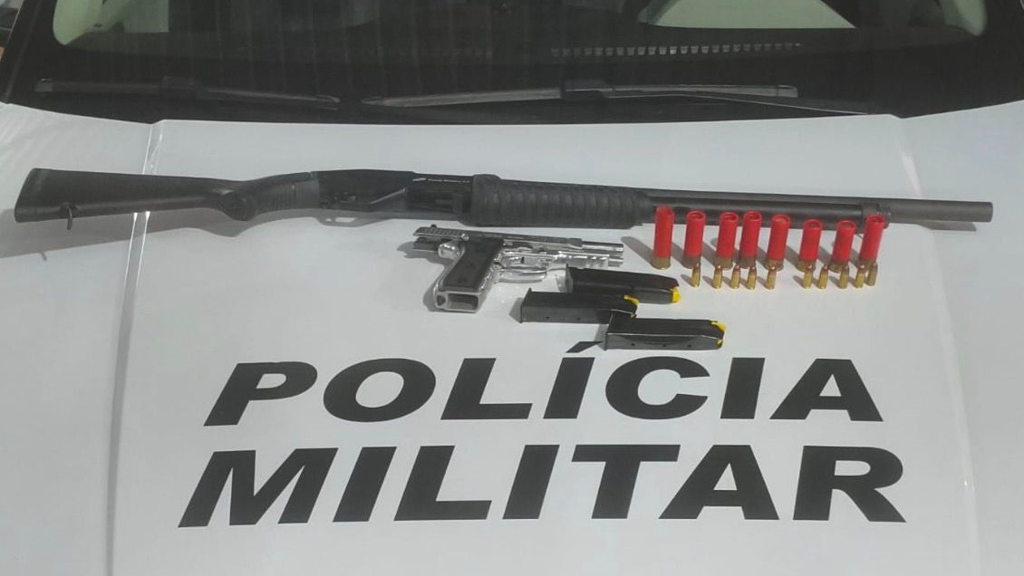 Com a informação de que o suspeito possuía armas de fogo, as equipes se deslocaram até a residência dele, no bairro Cabo e Soldados, onde o indivíduo foi localizado. Durante a abordagem, os policiais apreenderam: