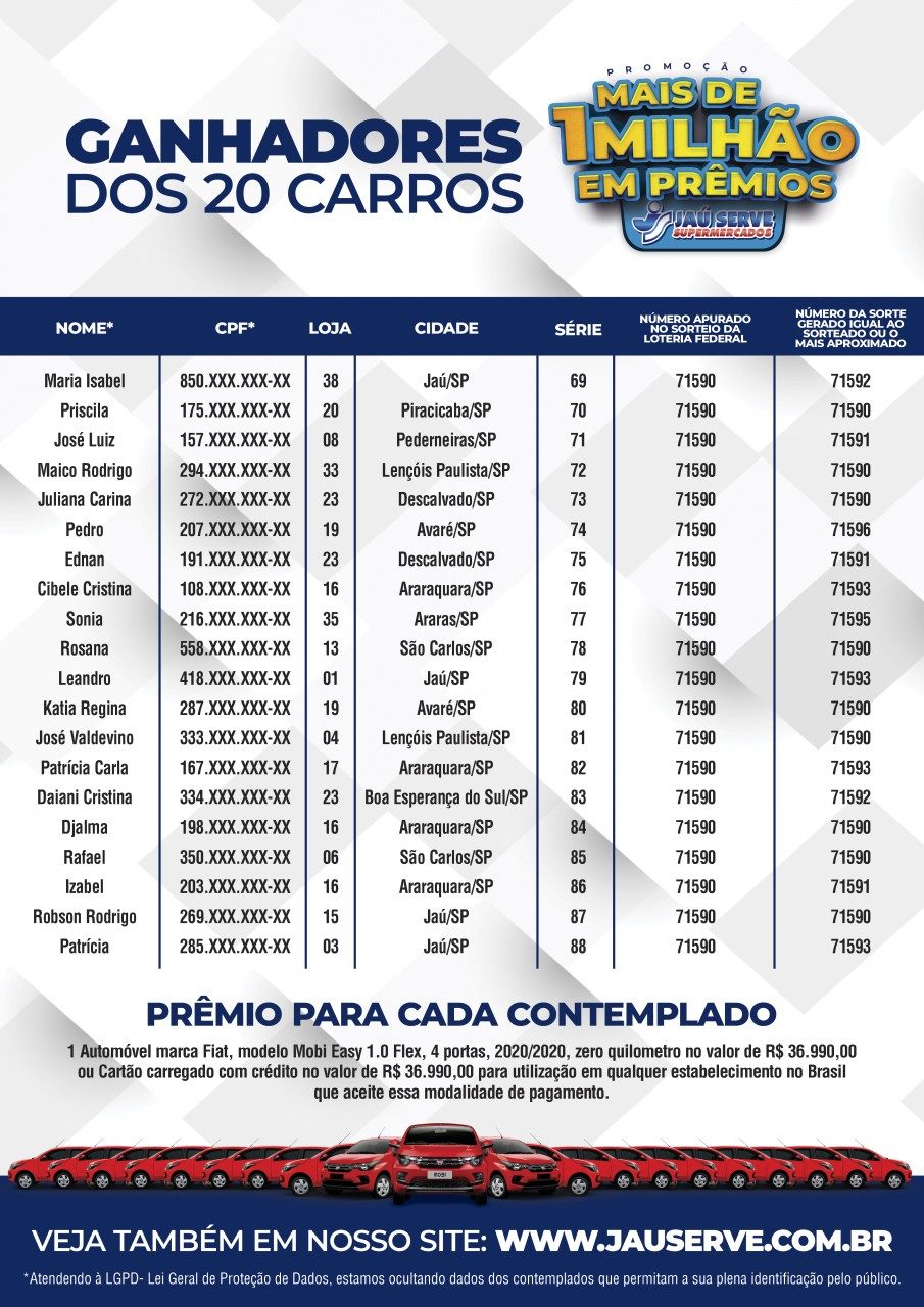 A rede Jaú Serve divulgou na tarde desta terça-feira, dia 12, os ganhadores da promoção que sorteou 20 carros entre seus clientes. No total foram mais de R$ 1 milhão em prêmios, além de descontos instantâneos durante a campanha de final de ano.
