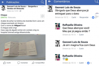 Para tentar encontrar o dono do cheque, ele postou a história no Facebook e avisou o banco. “Nunca havia acontecido algo parecido comigo. Fui acompanhar a minha chefe e achei o cheque no balcão onde se faz as apostas. Logo avisei o banco e postei em vários grupos no Facebook. Enquanto não encontrei o dono eu não sosseguei”, relata o jovem.