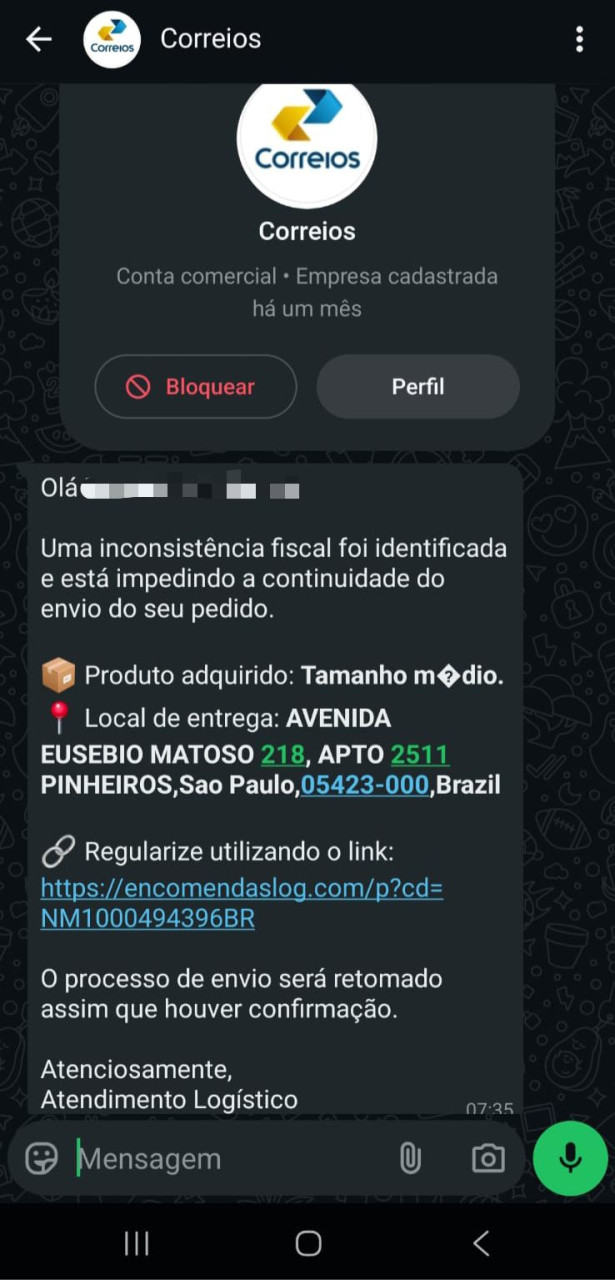 Segundo as informações divulgadas, a fraude usa o nome e o logotipo dos Correios para dar aparência de legitimidade. A mensagem informa que uma suposta encomenda estaria retida em um centro de distribuição e que é necessário pagar um valor para sua liberação — normalmente por meio de um link suspeito que direciona o usuário a um site falso.