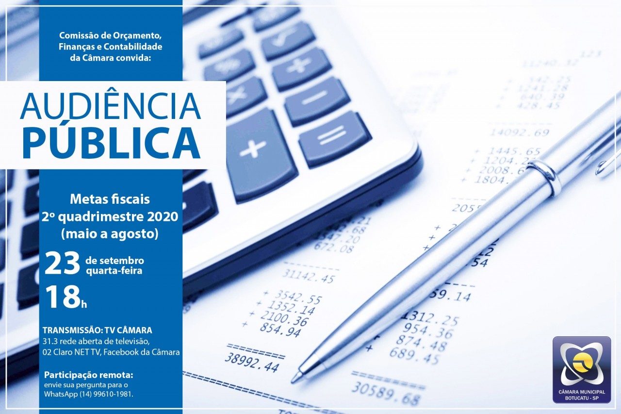 Em atendimento ao disposto na Lei de Responsabilidade Fiscal (art. 9º, §4º), o Poder Executivo, por meio da Secretaria Municipal de Governo, realizará AUDIÊNCIA PÚBLICA junto à Comissão de Orçamento, Finanças e Contabilidade da Câmara, para demonstração e avaliação do cumprimento das metas fiscais relativas ao segundo quadrimestre de 2020 (maio a agosto).