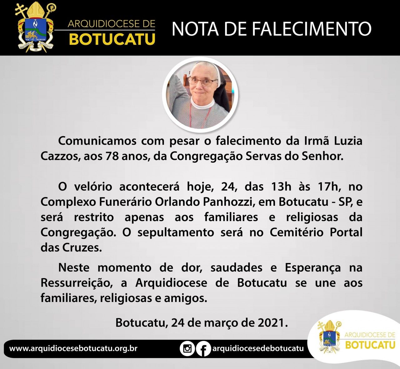 Neste momento de dor, saudades e Esperança na Ressurreição, a Arquidiocese de Botucatu se une aos familiares, religiosas e amigos”, diz comunicado da Arquidiocese.