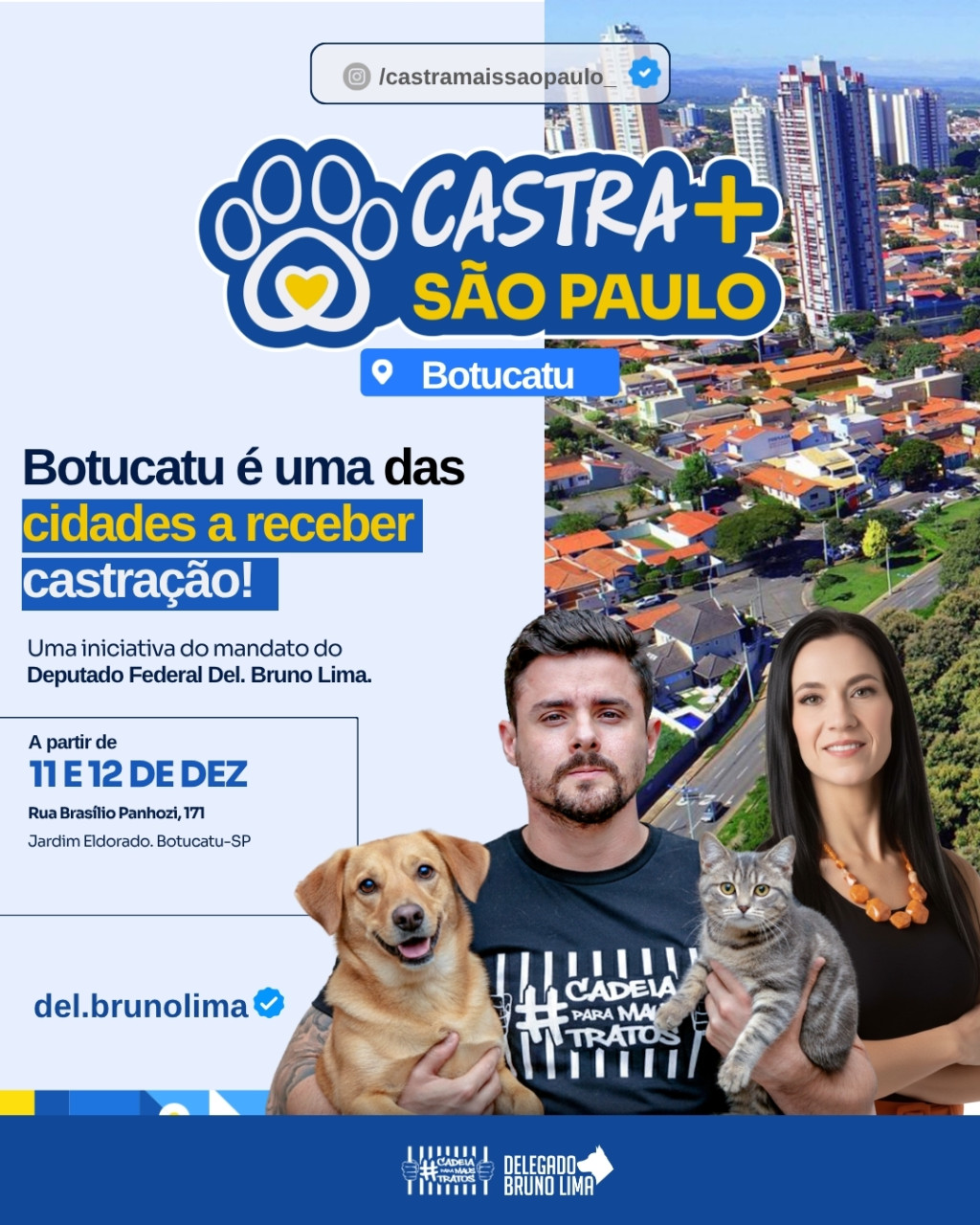 Botucatu receberá nos dias 11 e 12 de dezembro um mutirão de castração gratuita promovido pelo Deputado Federal Delegado Bruno Lima, com o apoio da vereadora Érika Liao, que intermediou a vinda da ação para o município.